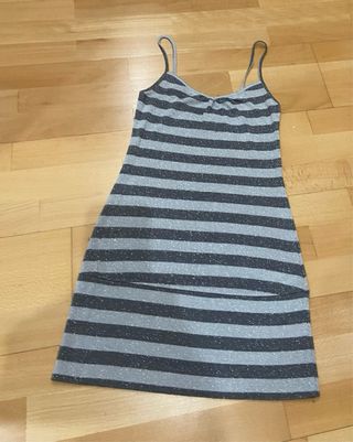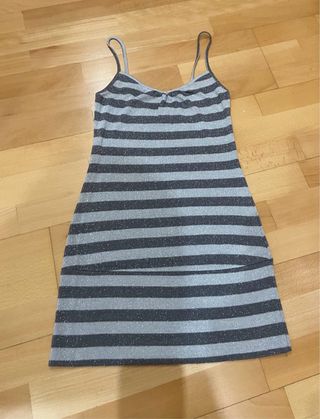 Vestido de tirantes con un diseño de rayas plateadas y grises. Es una prenda cómoda y llamativa. - Diseño de rayas brillantes. - Tirantes finos.
