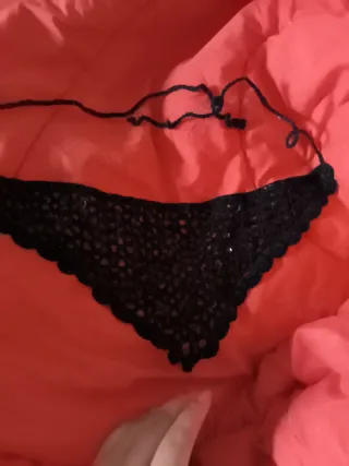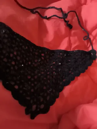 Bandana tejida a crochet con un toque de brillo. Ideal para complementar tu estilo. - Diseño triangular. - Acabado con lentejuelas. - Tiras para atar.