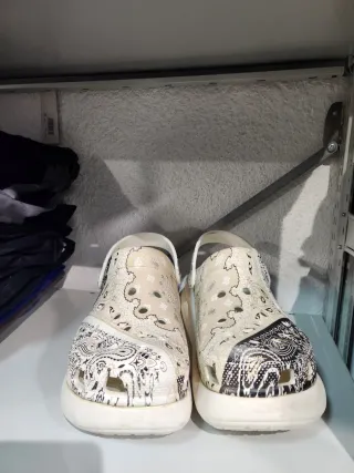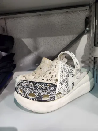 Zuecos Crocs Crush con estampado bandana, talla 46-47 en perfecto estado, mínimo uso. - Diseño patchwork con diferentes motivos. - Suela gruesa y cómoda. - Tira trasera para un ajuste seguro.