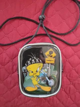Pequeño bolso con diseño de Piolín. - Piolín con bandana de calaveras. - Ilustración de Piolín con una moto. - Incluye un cartel de Tweety.