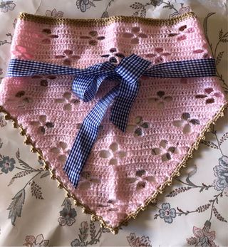 Preciosa bandana tejida a mano en color rosa, con un delicado borde y un diseño calado. - Tejido de ganchillo. - Incluye cinta de cuadros azul y blanco para atar.