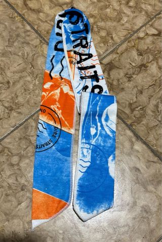 Bandana con diseño inspirado en Dire Straits. Presenta una combinación de colores vibrantes. - Diseño con motivos gráficos y texturas. - Borde con detalles de ondas y sellos postales.