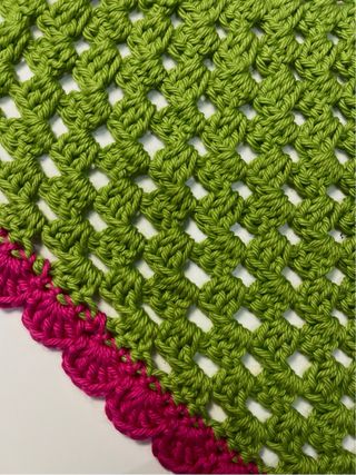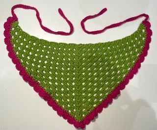 Bandana triangular de crochet, elaborada a mano con un diseño de red y borde festoneado. - Colores: verde y rosa fucsia. - Cierre con tiras de crochet para atar.