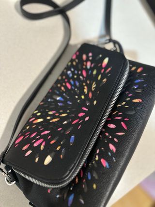 Bolso bandolera con un diseño vibrante y llamativo. - Estampado con motivos circulares y florales. - Cierre de cremallera. - Correa ajustable para llevar al hombro o cruzado. -Correa en buen estado con marcas de uso, bolso impecable. Precio : 3.99€ Se recoge en mano : -Madrid (a concretar día lugar y hora.)Por compras minimas. -Toledo unicamente en el Pueblo La Guardia. Envios atraves de Wallapop.