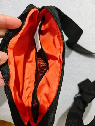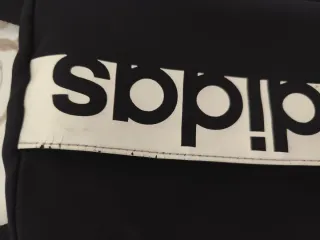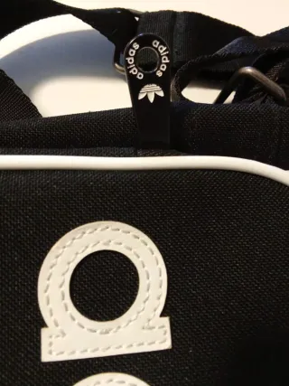 Bandolera Adidas en color negro con ribetes blancos. Los tiradores de las cremalleras tienen un aspecto un poco desgastado pero es meramente estético, funcionan perfectamente. También tiene una correa ajustable.