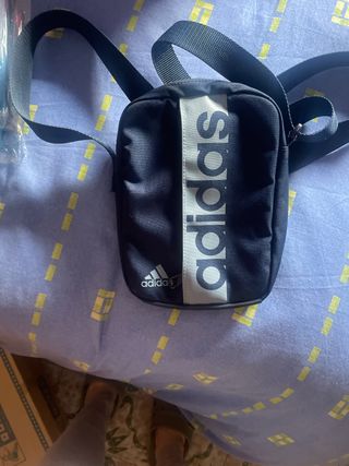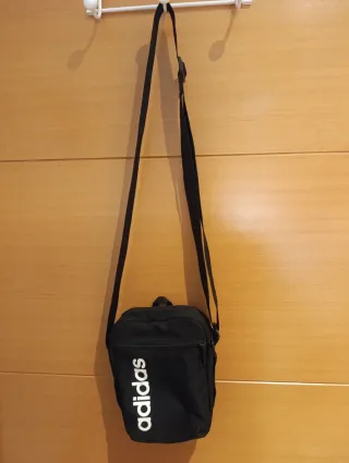 Bolso bandolera de estilo deportivo con el logo de Adidas. En buen estado, solo tiene marcas de uso