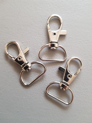Lote de 3 Herrajes mosquetón plateado, ancho 25 mm x largo 40 mm. 4 cm de paso cinta, giratorio 360 grados. Anilla en D con gancho mosquetón. Elemento para unir las correas y asas en bolsos, bandolera, cartera, llaves, tarjetas identificativas, etc. Envio no incluido.