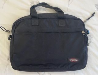 Maletin para ordenador o portafolios Eastpack. Color negro, dimensiones 40cm x 27cm x 6cm. Tiene un bolsillo central acolchado y un bolsillo externo para guardar accesorios. Posee una cinta con velcro en la parte posterior para fijarlo en el asa de las maletas con ruedas. Tiene anillas para colocar una cinta y poder portarlo al hombro (se entrega sin cinta bandolera). Está en muy buen estado.