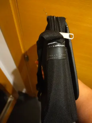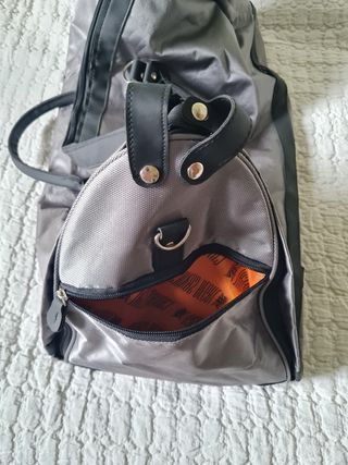 Bolso para llevar ordenador con asas y con bandolera. Varios bolsillos, con cremallera y con velcro. No pesa nada. La bandolera va con anillas y se le puede quitar. Para llevar ordenador, documentos...almohadillado para proteger ordenador