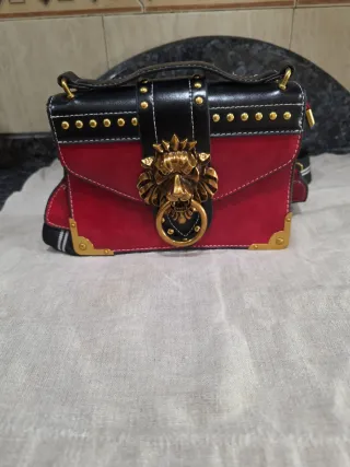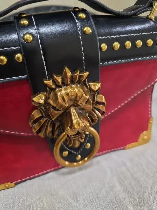 Bolso de diseño original con un llamativo detalle de cabeza de león. - Cierre con anilla. - Adornos metálicos dorados. - Combinación de piel negra y roja.