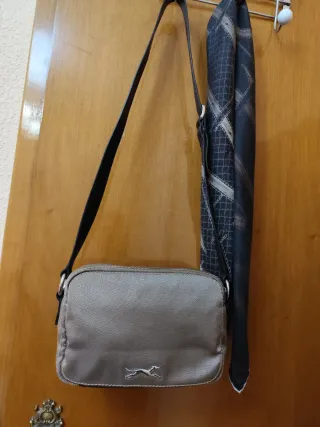 Bolso bandolera de piel. - Cierre con cremallera. - Correa ajustable. - Logo grabado en la parte frontal.