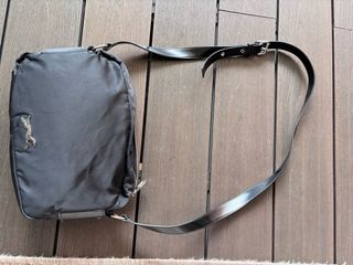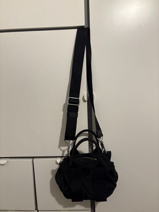 Bolso negro de Bimba y Lola con logo del galgo en dorado en la parte frontal. Material ligero tipo nylon, muy práctico y cómodo para el día a día. También ideal para salir de noche. ✨ Doble asa corta de mano + correa larga ajustable y extraíble (se puede llevar como bandolera). ✨ Herrajes en dorado. ✨ Tamaño mediano con buena capacidad. ✨Bolsa al interior con cremallera Está en buen estado, con leves signos normales de uso. Muy versátil y combinable.