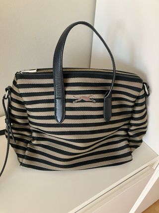 Bolso de mano y bandolera que se puede quitar, con un diseño de rayas negras y beige en textil - Base bolso cuero negro - Asa corta de cuero. - Correa larga ajustable de cuero negro - Detalle metálico de galgo. - Cierre de cremallera. - Dos bolsillos interiores, uno de ellos con cremallera - Forro interior en tela negro