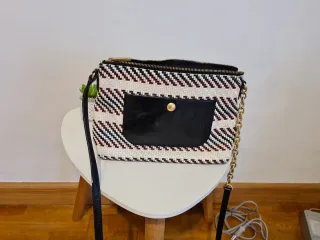 Bolso bandolera con estampado geométrico en tonos blanco, negro y burdeos, con detalle de bolsillo frontal en negro y cadena metálica dorada. Tiene asa regulable para llevar al hombro o cruzado. Tamaño ideal para llevar lo imprescindible con estilo. ✔️ Muy poco uso ✔️ En buen estado ✔️ Cómodo y ligero Perfecto para looks informales o para dar un toque diferente a cualquier conjunto.