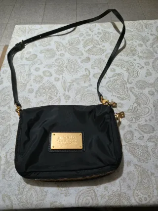 Bolso negro de Bimba y Lola con logo del galgo en dorado en la parte frontal. Material ligero tipo nylon, muy práctico y cómodo para el día a día. También ideal para salir de noche. ✨ Doble asa corta de mano + correa larga ajustable y extraíble (se puede llevar como bandolera). ✨ Herrajes en dorado. ✨ Tamaño mediano con buena capacidad. ✨Bolsa al interior con cremallera Está en buen estado, con leves signos normales de uso. Muy versátil y combinable.