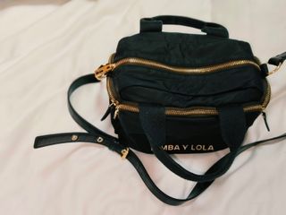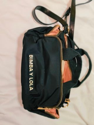 Bolso de mano y bandolera de la marca Bimba y Lola. En buen estado pero con algunas manchas por dentro por el paso del tiempo y uso. Precio en su día 87€ en rebajas. - Diseño moderno y funcional. - Acabados dorados en cremalleras y detalles. - Asa corta superior y correa ajustable. - Logo de la marca visible.