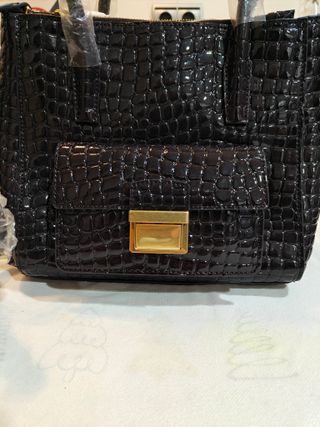 Bolso BIMBA Y LOLA original en color negro, con acabado efecto cocodrilo brillante. Diseño elegante y estructurado, con doble asa de mano y correa larga para llevar al hombro o cruzado. Interior amplio con compartimentos y cierre con cremallera. Nuevo sin uso, con protecciones en asas y herrajes. Marca: BIMBA Y LOLA Tipo: Bolso de mano / bandolera Estilo: Elegante / urbano Color: Negro Acabado: Efecto cocodrilo (brillante) Estado: Nuevo sin uso Cierre: Cremallera superior Asas: Dobles de mano + correa larga extraíble Interior: Forro textil con bolsillos