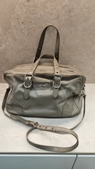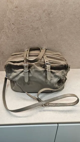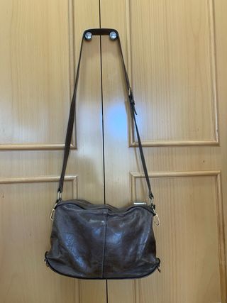 Bolso original Bimba Y Lola de piel color entre gris y marrón. De mano y bandolera todo ajustable. Es mediano de tamaño, pero al ser doble es de gran capacidad. Usado, pero bien conservado y limpio por dentro.