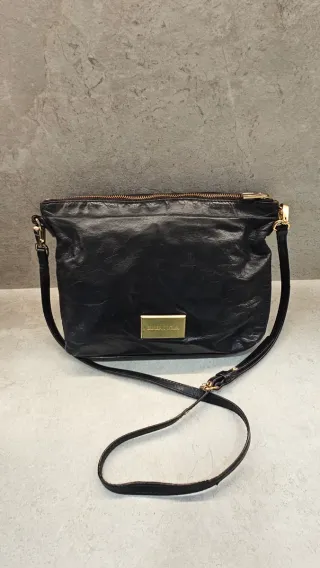 Bolso bandolera de piel Bimba y Lola de piel en color negro. - Placa frontal dorada con logo con signos de desgaste ( adjunto foto) - Correa ajustable. - Cierre de cremallera doble usado pero buen estado