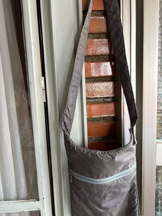 - Medidas: 25x30x4cm - Color gris azulado - Material Oxford, resistente al agua, reciclado, duradero y ligero - Asa bandolera regulable. - Compartimento principal con cierre de cremallera. - Pequeño bolsillo frontal. - Está nueva sin usar No hago envíos