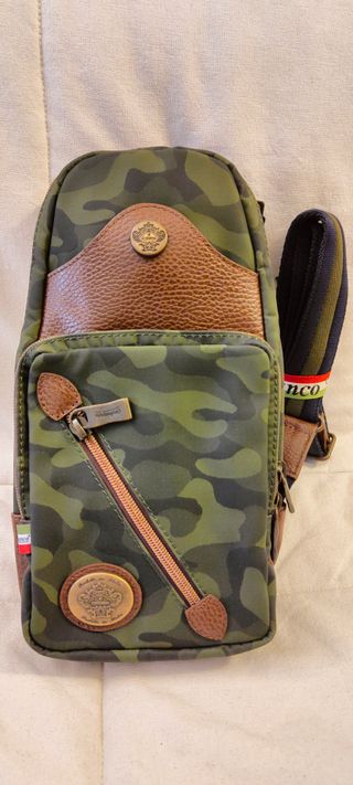 Made in Italy, Sling bag, bandolera, confeccionada en nylon engomado hidrófugo y piel, con detalles metálicos. Serie especial Camuflaje Verde. Precio al público € 160 Lleva tus pertenencias con estilo con el bolso de hombro Ibridello Con capacidad suficiente para una botella de agua, esta bandolera es perfecta para moverse por la ciudad y para pequeñas excursiones. 4 bolsillos exteriores en total, correa de hombro Múltiples puntos de fijación para el máximo confort, forro y hardware de marca con el logotipo Orobianco Dimensiones aproximadas: 15 cm (Largo), 33 cm (Alto), 7 cm (Ancho) Peso aprox. 600 g Nuevo de stock de venta