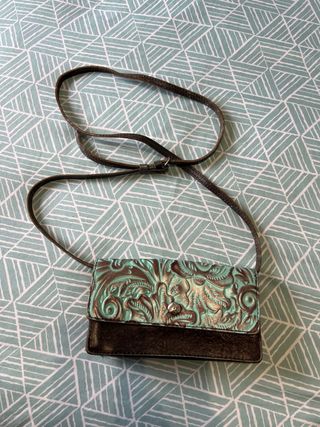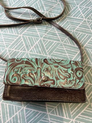 Bolso Bandolera Patricia Nash - Cuero Labrado Turquesa (Modelo Balloi) bolso tipo bandolera (crossbody) de la prestigiosa marca Patricia Nash Es el modelo Balloi, conocido por su artesanía y elegancia vintage. • Diseño único: Cuero auténtico con un grabado floral espectacular en relieve (tooled leather) en tonos marrón oscuro y un vibrante color turquesa/verde agua. • Estado: En excelente estado, muy poco uso (puedes ver el detalle del cuero y la correa en las fotos). • Versatilidad: Correa larga ajustable y fina, perfecta para llevar cruzado de forma cómoda y ligera. • Detalles: Cierre de solapa con botón magnético.