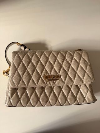 Precioso bolso bandolera de Guess en color beige. Está en muy buen estado y es ideal para el día a día. - Asa de hombro y bandolera de cadena. - Cierre de solapa con broche. - Diseño con el logo de Guess grabado.
