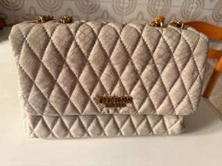 Precioso bolso bandolera Guess en color plateado. Se encuentra en muy buen estado. - Diseño acolchado con textura elegante. - Asa de cadena metálica. - Cierre con broche metálico con logo Guess.