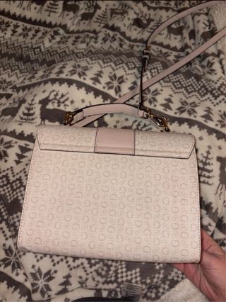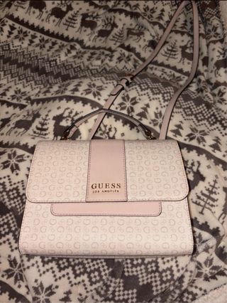 Bolso de mano y bandolera en color rosa palo, marca GUESS.Muy poco uso, está prácticamente nuevo, en muy buen estado. - Diseño con detalles troquelados. - Asa corta y correa larga ajustable. - Logo metálico de la marca en la parte frontal.