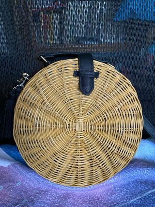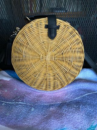 bolso redondo de mimbre Mango con bandolera negra ajustable. Nuevo, sin usar.