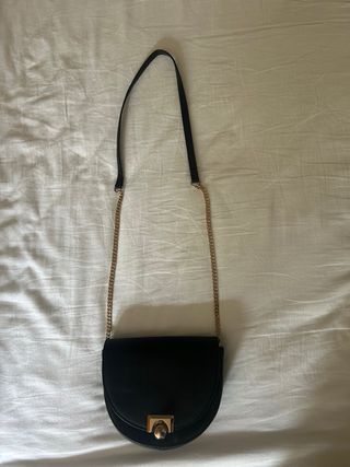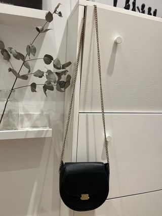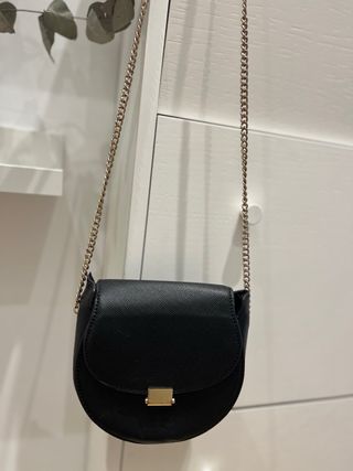 Precioso bolso bandolera de color negro. Es pequeño y elegante, ideal para llevar lo esencial. - Asa de cadena dorada. - Diseño de solapa.