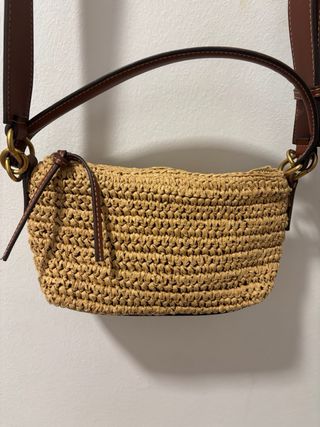 Bolso bandolera sin etiquetas, en muy buen estado y usado solo en pocas ocasiones. Material: paja y poliéster, con forro interior y cierre de cremallera. Incluye un llavero original de Mango (comprado aparte). Correa larga de 128 cm, ideal para llevar al hombro o cruzado. Consulta las últimas fotos para ver las medidas exactas del bolso. Perfecto para un look casual, boho o veraniego. Se le puede dar una segunda vida. ¡Lista para enviártelo! VENTA SOLO POR ENVÍO.