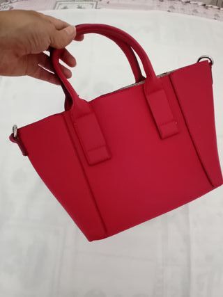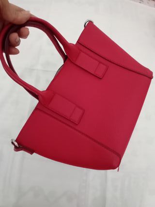 Bolso bandolera de polipiel color rojo. Se puede colgar con cadena (no incluida). Cierre magnético y asas para llevar como bolso de mano. En perfecto estado. En las fotos puedes ver el tamaño. En mi perfil tengo cosas que podrían interesarte, puedes echar un vistazo y si te interesa algo más, podemos agruparlo en un lote. Hago envíos por Wallapop.