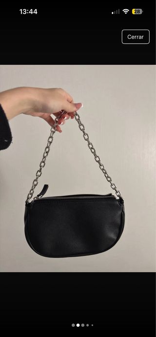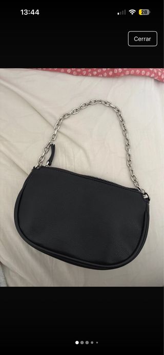 Bolso pequeño de estilo bandolera con un diseño moderno. - Asa de cadena metálica. - Cierre de cremallera. - Material con textura.