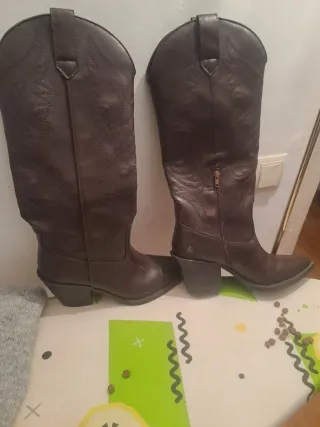 Botas de estilo cowboy en color marrón. Talla 39-40. - Diseño con costuras decorativas. - Tacón de bloque. - Punta afilada.