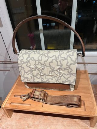 Mini bolso bandolera de la marca TOUS, modelo Kaos Icon. - Color beige con estampado. - Detalles en marrón. - Asa superior y correa ajustable. Precio negociable.