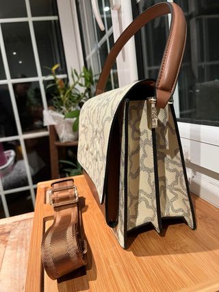 Bolso Tous modelo Audree Kaos. - Diseño con estampado Kaos. - Combinación de colores beige y marrón. - Asa de hombro y correa ajustable para llevar de bandolera. precio en tienda 169€! Tiene la piel levantada en dos partes de la asa interna.