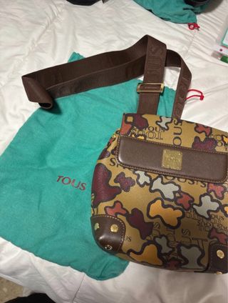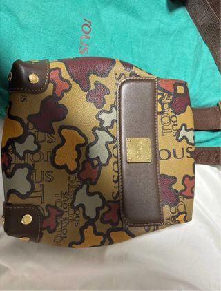 Bolso bandolera Tous con un diseño estampado. - Color beige con estampado en marrón. - Asa de mano y correa ajustable. - Cierre de cremallera. Muy espaciosa, diversos compartimentos internos ,ideal para viajar, ir a la oficina , estudiar o adaptarla al carro del bebé. Tiene una pequeña mancha en el forro interno que no se ve desde fuera y no afecta para nada a la estética. usada 5 veces