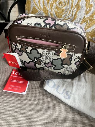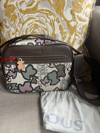 Bandolera de la marca Tous con un diseño llamativo. - Estampado multicolor. - Detalles en piel marrón. - Cierre de cremallera. - Incluye charm de oso. - Correa ajustable. Nuevo con etiquetas y saco guardapolvo