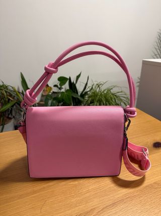 Bolso de mano o bandolera en color rosa. - Logo de la marca en relieve en la solapa. - Correa de hombro ajustable y extraíble con logo. - Cierre de solapa. - Asa superior con nudos decorativos. Con dos pequeñas manchas lavables en el interior. Pero en perfecto estado. Usado dos veces.
