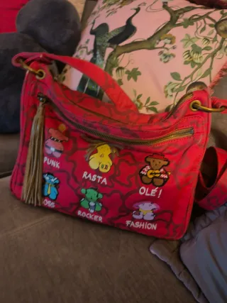 Bolso de mano y bandolera con estampado de osos. - Cierre de cremallera. - Asa corta y correa larga ajustable. - Detalle de charm de oso. - Bolsillo exterior con cremallera. Los desperfectos que tiene son: descolorido en el oso de color dorado, un diente roto de una de las cremalleras de un bolsillo, pero sigue pasando bien la cremallera. El resto de cremalleras y dientes están genial.
