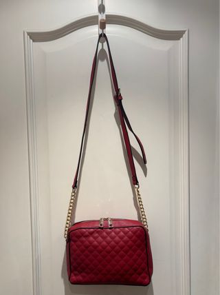 Bolso bandolera con diseño acolchado y detalles en cadena dorada. - Color rojo cereza. - Cierre principal con cremallera. - Bolsillo frontal con cremallera. - Bolsillo interior con cremallera y dos compartimentos más sin cremallera - Correa ajustable acabada en cadena dorada. - Acabado mate. - 24 x18 x5,5 cm