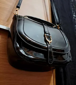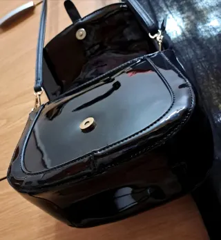 ● Bolso de hombro confeccionado en charol. ● 22 Cm ● Buena cabida de fondo con compartimientos más pequeños interiores para organizar enseres adecuadamente. ● Cierre botónClip ● Asa ajustable.