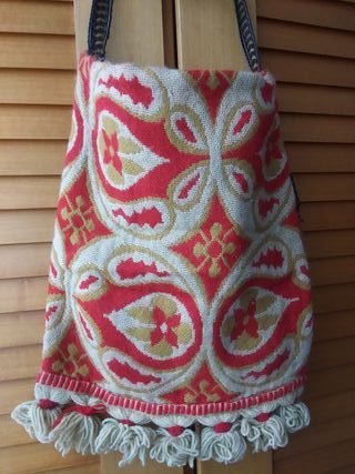 BANDOLARA, de tela, color marrón, beige y rojo, greca en parte delantera. Ancho 32 cm. alto 40 cm.