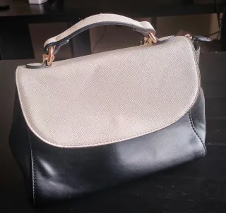 Elegante bolso de mano que también se puede usar como bandolera. Su diseño bicolor lo hace muy versátil. - Asa superior. - Cierre de solapa. - Combinación de texturas. Combina una base negra lisa con una solapa superior con textura granulada en color blanco. Asa superior y correa para el hombro ajustable, con longitud regulable. Cierre: solapa frontal con cierre magnético en tono dorado. Interior forrado en color negro, con varios compartimentos: dos grandes con cremallera y dos pequeños abiertos. Medidas: Largo: 24 cm Ancho: 11 cm Alto: 18 cm Correa para hombro: 74 cm (ajustable) #bolsos #bolsosDeMano #bolsosDeHombro .