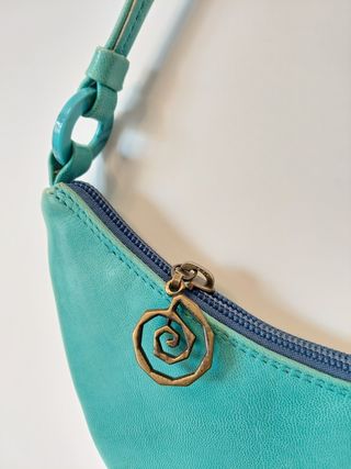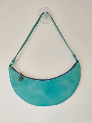 Precioso bolso bandolera de la marca Ursula Mascaró. Es de color turquesa y tiene un diseño de media luna. Asa larga para llevarlo al hombro. Cierre de cremallera con un detalle metálico. Piel suave y agradable al tacto. Medidas: largo 33 cm; ancho 12 cm: alto (con asa): 40 cm. Si buscas algo especial mira otros artículos de mi armario.