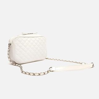 Elegante bolso bandolera en tonos beige y plata. Ideal para ocasiones especiales. - Asa de cadena metálica. - Cierre de broche metálico. - Diseño elegante y sofisticado.
