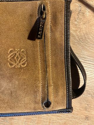 Bolso bandolera Loewe de estilo vintage. - Confeccionado en ante y piel. - Detalle de logo grabado. - Cierre de cremallera.