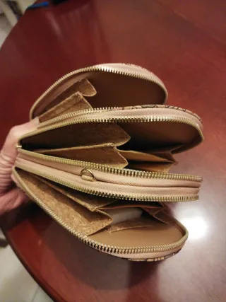 Bolso de mano o con tira para llevar al hombro. - Material exterior de piel - Cierre con cremallera dorada. - Dos asas cortas y una tira larga. - Bolsillo exterior frontal.