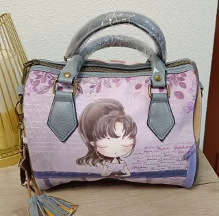 Bolso con un diseño dulce y juvenil, adornado con una ilustración de una chica y detalles florales. Marca Candy Sweet. - Estampado de chica con flores y texto. - Cierre de cremallera. - Asas superiores. - Detalle de borla Tiene correa y se puede utilizar de bandolera. Con etiqueta.